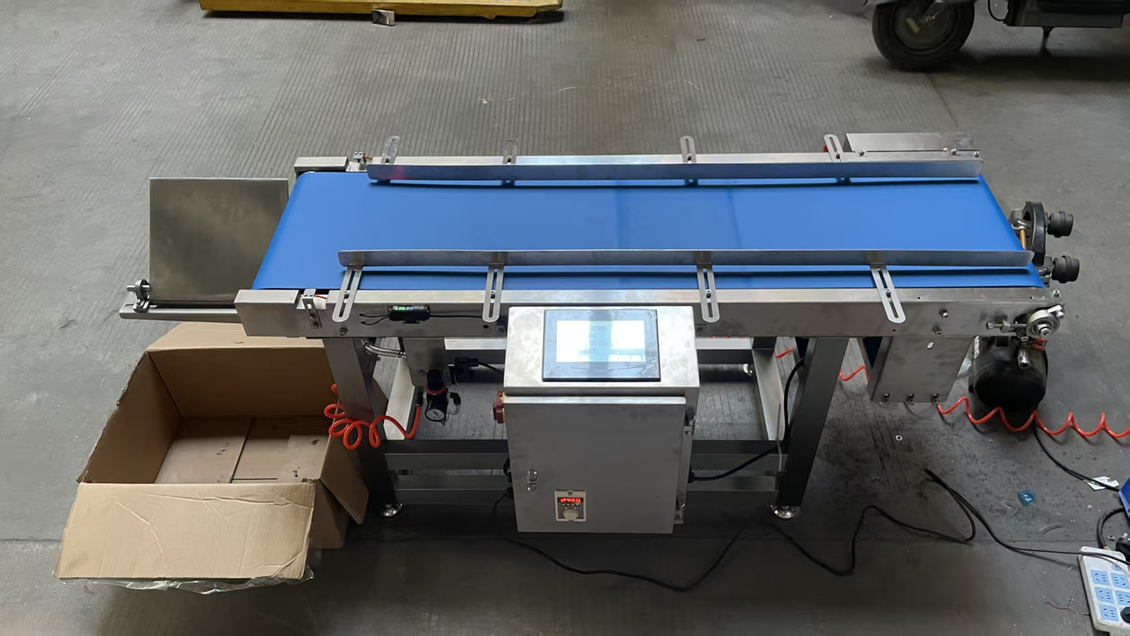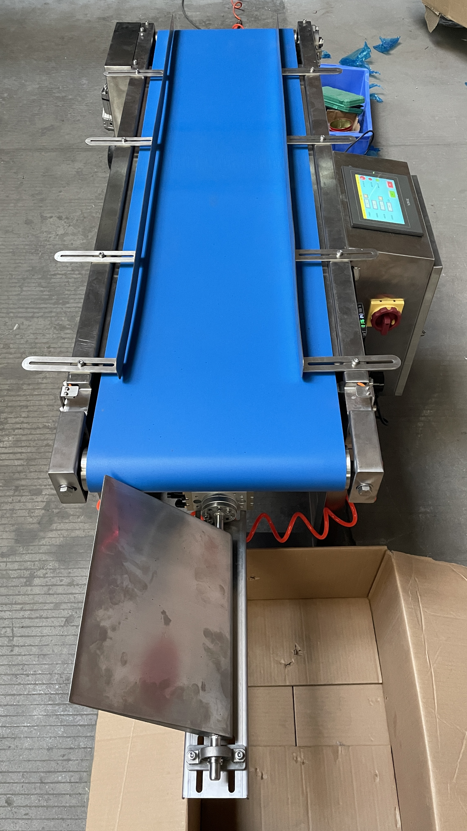 1.The product is accurately counted. The conveyor belt can be customized to have adjustable width and can accommodate more product sizes. 2.*Automatically sort products left and right, making it convenient for the production line to pack. 3.The touch screen allows for free setting of the quantity, with no restrictions. 4.Adjustable speed motor, the speed can be adjusted by yourself. 5.The speed can reach 150 to 300 products per minute. The specific count equipment usage premise depends on the actual working conditions and product size. To ensure the orderliness of the products, there should be intervals between them. Only one product can pass through the counting equipment at a time, and multiple products cannot pass through simultaneously. Products cannot overlap. 1.The height of the belt from the ground:80mm+50mm (customized) 2.The belt of width :300mm (can customized ) 3.Machine length :1200mm(can customized) 4.Material :SUS 304 5.conveyor speed:40 meters per minute (Adjustable speed) 6.The special structural design can effectively prevent vibration. This conveyor belt is suitable for transporting items that fall from the packaging machine to the next machine.