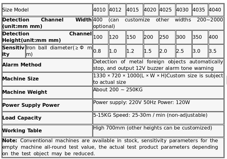 1. The upper and lower radiation coils are combined with the permanent magnet signal processing technology, which has high sensitivity and high anti-interference ability. 2. The intelligent magnetic induction processing system can automatically discharge non-ferrous metal films such as aluminum foil packaging. 3. The signal processing is completed by digital circuits, which is simple to adjust, stable and reliable, and has a counting function, which distinguishes between good and bad products. 4. With anti-leak detection function. When there are multiple metal signals passing through, the instrument will automatically detect the number of signals, and the actuator will not be missed during the action. It has a conveyor belt to prevent the deviation device. 5. The whole machine is made of stainless steel material, food grade conveyor belt, waterproof and dustproof design. 6. The detector adopts sound and light alarm, and it can be stopped at the same time and can be automatically reversed. The operation is convenient and reliable, and it has superior shock resistance.