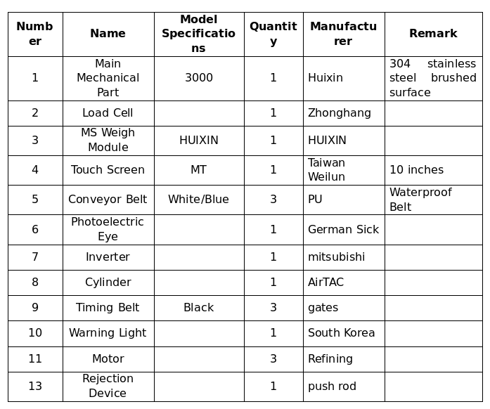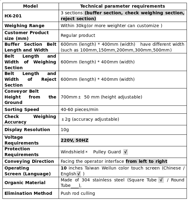 This product is suitable for testing whether the weight of a single product is qualified, and is widely used in many industries such as electronics, pharmaceuticals, food, beverages, health care products, daily chemicals, light industry, and agricultural and sideline products. The RCM328 control module is an industrial-grade dynamic weighing control module, which can achieve high-speed, dynamic, and highprecision real-time weighing, and output the weighing results via Ethernet or serial. This module is specially designed for static and dynamic belt sorting weighing, and the internal digital filtering processing can effectively suppress interference such as motor rotation, belt rotation, and object impact. The module supports two Ethernet interfaces and can be cascaded with multiple modules in a daisy chain. Ethernet supports standard MODBUS TCP/IP protocol, standard MODBUS RTU Over TCP/IP protocol, and also supports HTTP protocol to read and set parameters. module’s serial bus uses the standard Modbus RTU protocol, with half-duplex RS-485 serial port transmission, which can set interface parameters, sampling and parameters, scale settings, measurement value calibration parameters, tare and zero parameters, and status detection parameters. *Specially designed to increase production capacity and improve production efficiency; * High-speed sampling control makes the equipment faster and more precise; *10-inch large color touch screen, easy to use; * Whole body 304 stainless steel structure *A variety of product preset functions, switching products is simple and fast; * Using Mitsubishi frequency conversion products, the speed is adjustable; * The modular structure is easy to maintain and clear; * Zero point tracking: manual or automatic zero clearing, and dynamic zero point tracking; *Customizable: The model can be customized according to the size of the customer’s product.