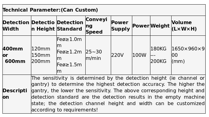1. High Sensitivity, detection gantry height of 12cm, detection of 1.0mm diameter fine iron filings, nine point test method does not miss detection.