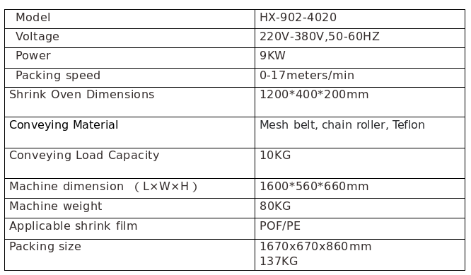 1.The sealing blade uses a DuPont Teflon-coated, high-temperature resistant aluminum alloy blade. The seal will not crack, char, or produce smoke, resulting in zero pollution. 2.Automatic feeding; the length can be automatically adjusted via a combination of photoelectric sensors and timers. Equipped with an induction motor, it automatically winds up waste material. 3.Equipped with imported photoelectric sensors, it can easily complete sealing and packaging operations for packages of different sizes. 4.The temperature controller uses a digital display temperature controller with built-in PID function, ensuring extremely sensitive and precise sealing blade temperature, which can be set arbitrarily. The sealing blade itself also has an automatic protection function to effectively prevent accidental cutting of packaging materials. 5.Adjustments are very simple when the size of the packaging material changes, without the need to change the mold or bag maker. 6.The sealing and cutting part of the machine is equipped with an acrylic protective cover and has an automatic alarm function, greatly improving operator safety. 7.The entire machine truly achieves unmanned operation connection with the productionline. Applications: Suitable for large-volume shrink packaging in industries such as software, food, cosmetics, printing, pharmaceuticals, flooring, ceramics, beverages, and hardware. HX-902