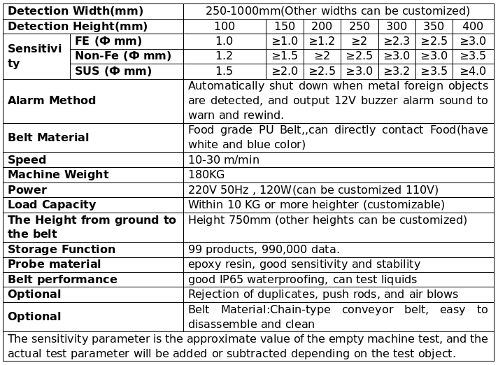Food, medicine, chemical industry, leather, knitting and other industry products, used to detect metal impurities mixed in various products or raw materials during production and processing. Such as: iron and non-ferromagnetic metal objects (common metals such as iron, copper, aluminum, stainless steel, etc. can be detected)